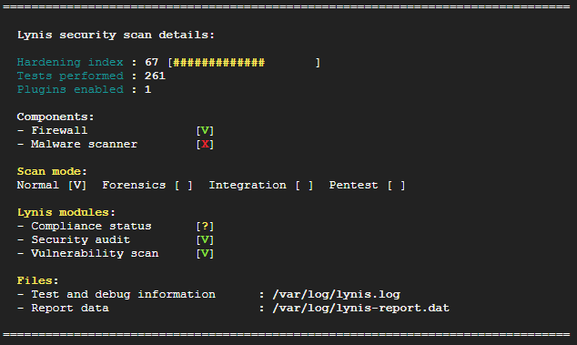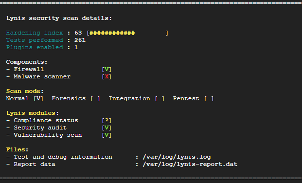 Pour commencer, je fait un instantané de ma VM au cas où elle brise. Ensuite, j’installe Lynis via: sudo apt install lynis et vérifie son installation avec lynis -v. Maintenant que je sais que c’est installé, il me reste à exécuter la commande suivante: sudo lynis audit system.