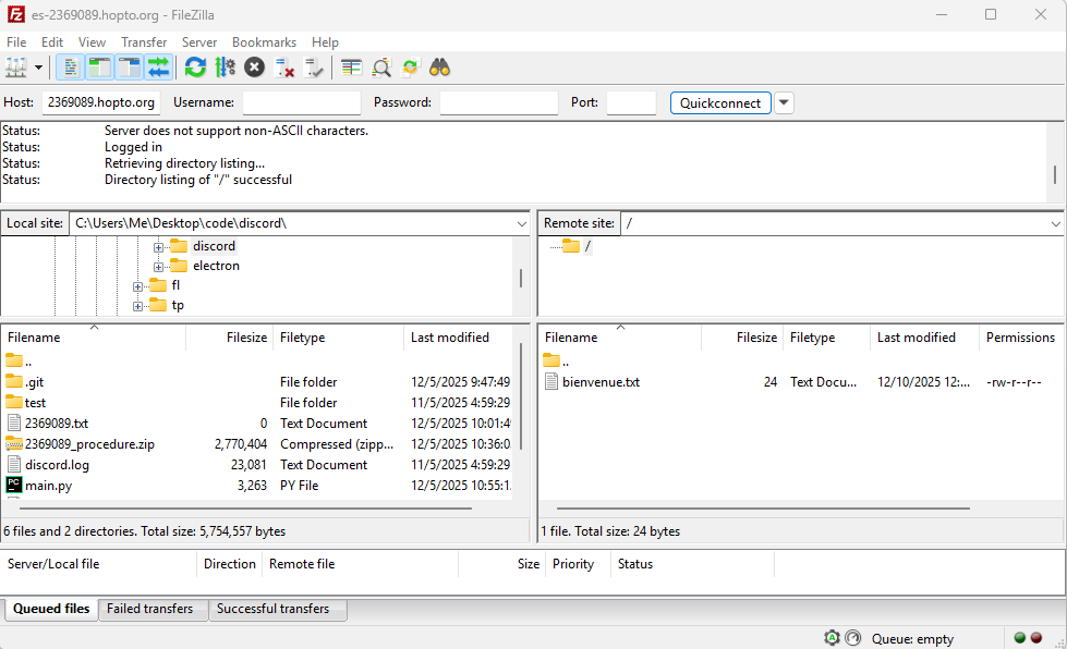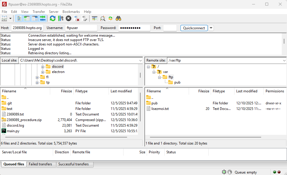« pasv_address=<IP EXTERNE> ». Ceci permet la lecture , l’écriture et autorise les ports entre 42000 et 42069. Donc, j’ai ajouté une règle de pare-feu qui autorise les ports (42000-42069) et les adresses ip (0.0.0.0/0). Maintenant, je voulais me connecter au ftp avec FileZIlla, une application fait pour cela mais cela me refusait l’entrée donc j’ai fait appel à ChatGPT qui me disait que mon erreur venait du code donc je le changais, mais maintenant l’erreur venait sur une autre parti du code. Finalement, j’avais le bon code depuis le début et ma règle de pare-feu n’autorisait pas le port 21, celui de base pour FTP.