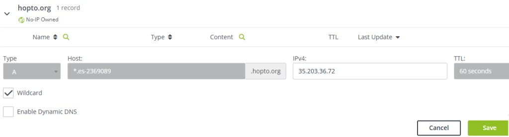J’ai pris mon ip publique (35.203.36.72) et je l’ai inséré à côté du nom de domaine pour les associer. Aussi, j’ai coché l’option « Wildcard » afin de pouvoir rajouter des sous-domaines (zabbix.es-2369089.hopto.org au lieu de es-2369089.hopto.org).